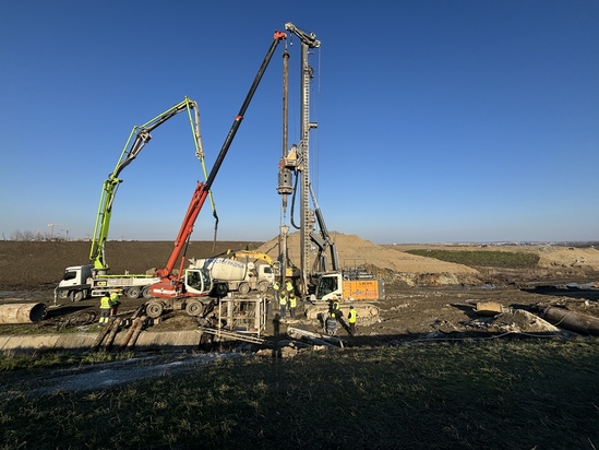 桩基施工采用螺旋钻孔灌注桩施工工艺,打桩设备稳步推进成孔作业,吊车配合完成钢筋笼吊装定位,混凝土泵车与混凝土罐车协同作业,连续完成混凝土浇筑与成桩,各工序衔接紧密、运转高效,作业人员全程检测,施工现场安全规范、井然有序,顺利完成首根工程桩的浇筑任务。